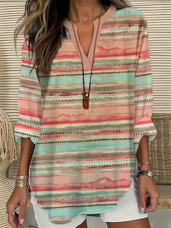 Damen abstrakte Streifen Langarm Bluse Frühling/Herbst Print V-Ausschnitt Täglich Lässig Oberteile