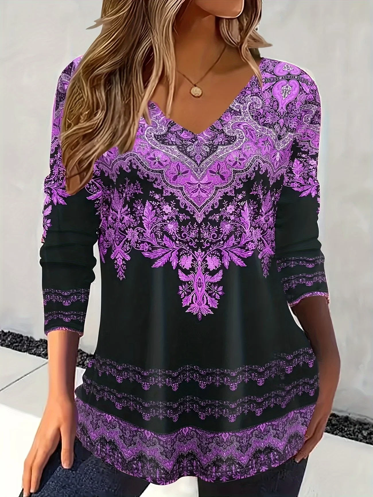 Damen Ethnisch Langarm T-Shirts T-Shirt V-Ausschnitt Print Lässig T-Shirt mit Grafik Frühling/Herbst Oberteile