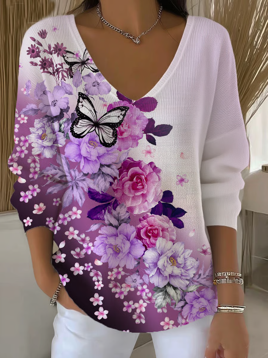Damen Geblümt Langarm T-Shirts T-Shirt V-Ausschnitt Print Lässig Frühling/Herbst Oberteile