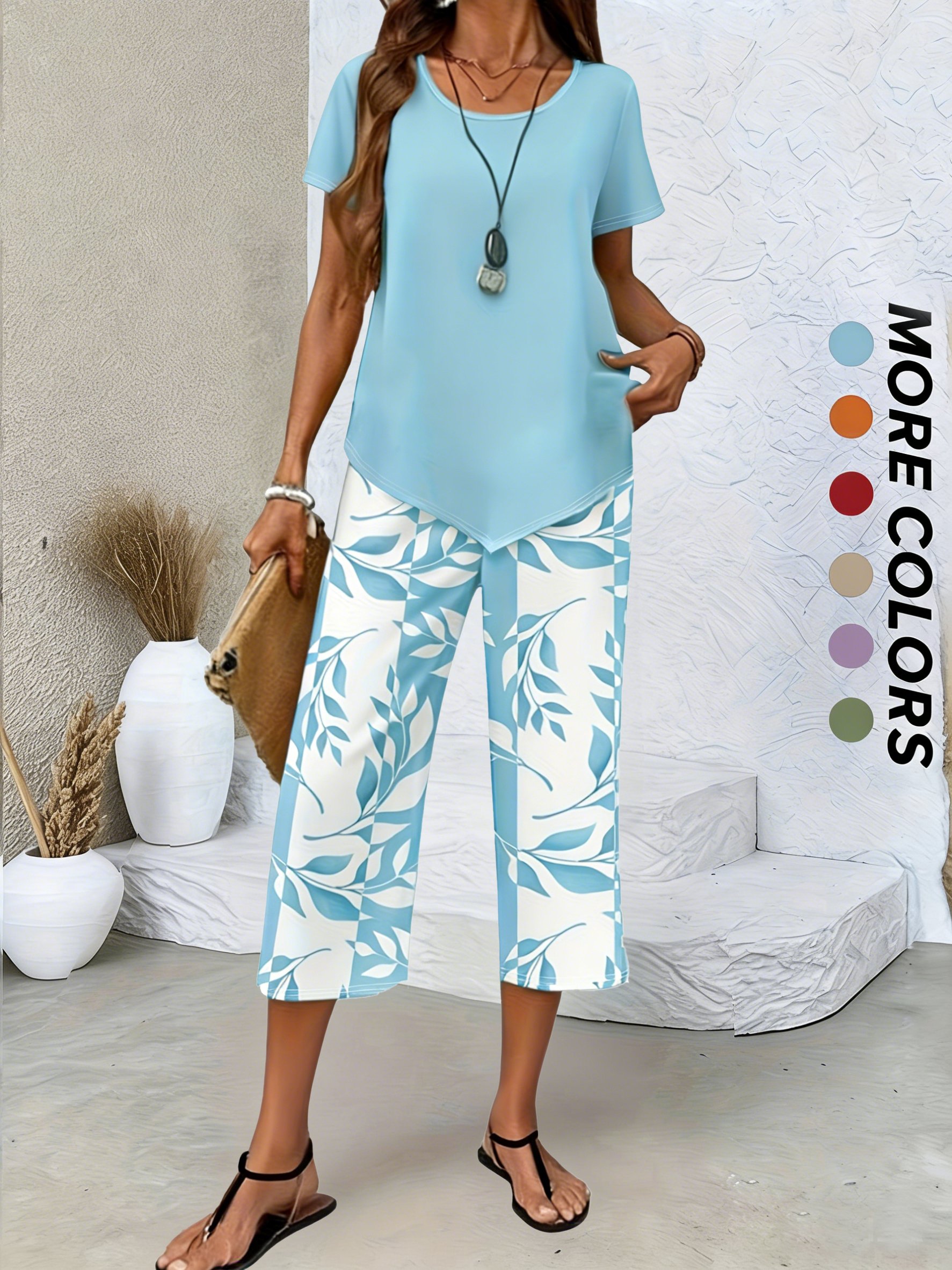 Damen Geblümt Zweiteiliges Set Täglich Kurzarm Lässig Sommer Bluse mit Hose Matching Set