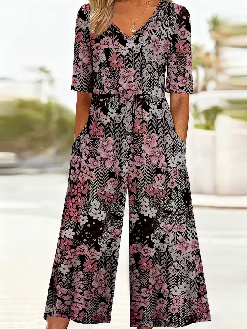 Damen Geblümt V-Ausschnitt Halbarm Lässig Sommer Jumpsuit
