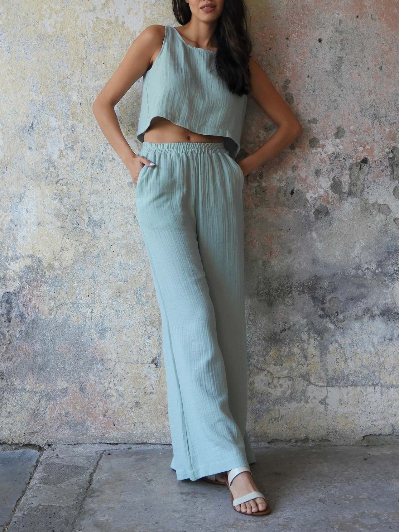 Damen Unifarben Nahtverarbeitung Zweiteiliges Set Täglich Ärmellos Lässig Sommer Bluse mit Hose Matching Set